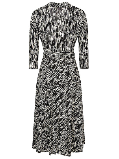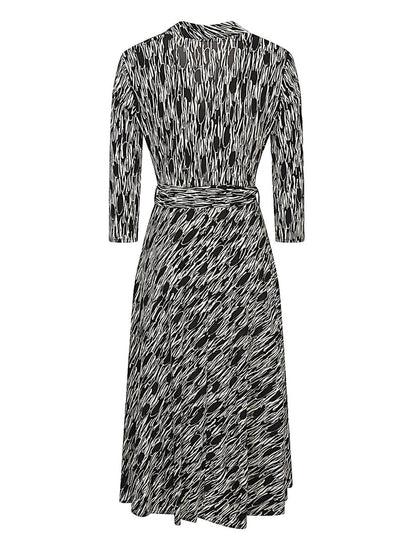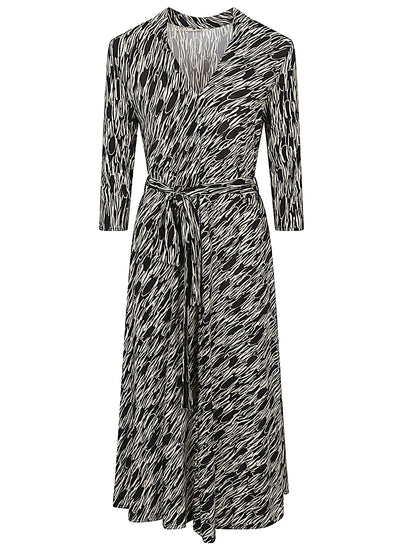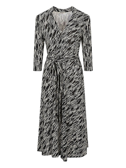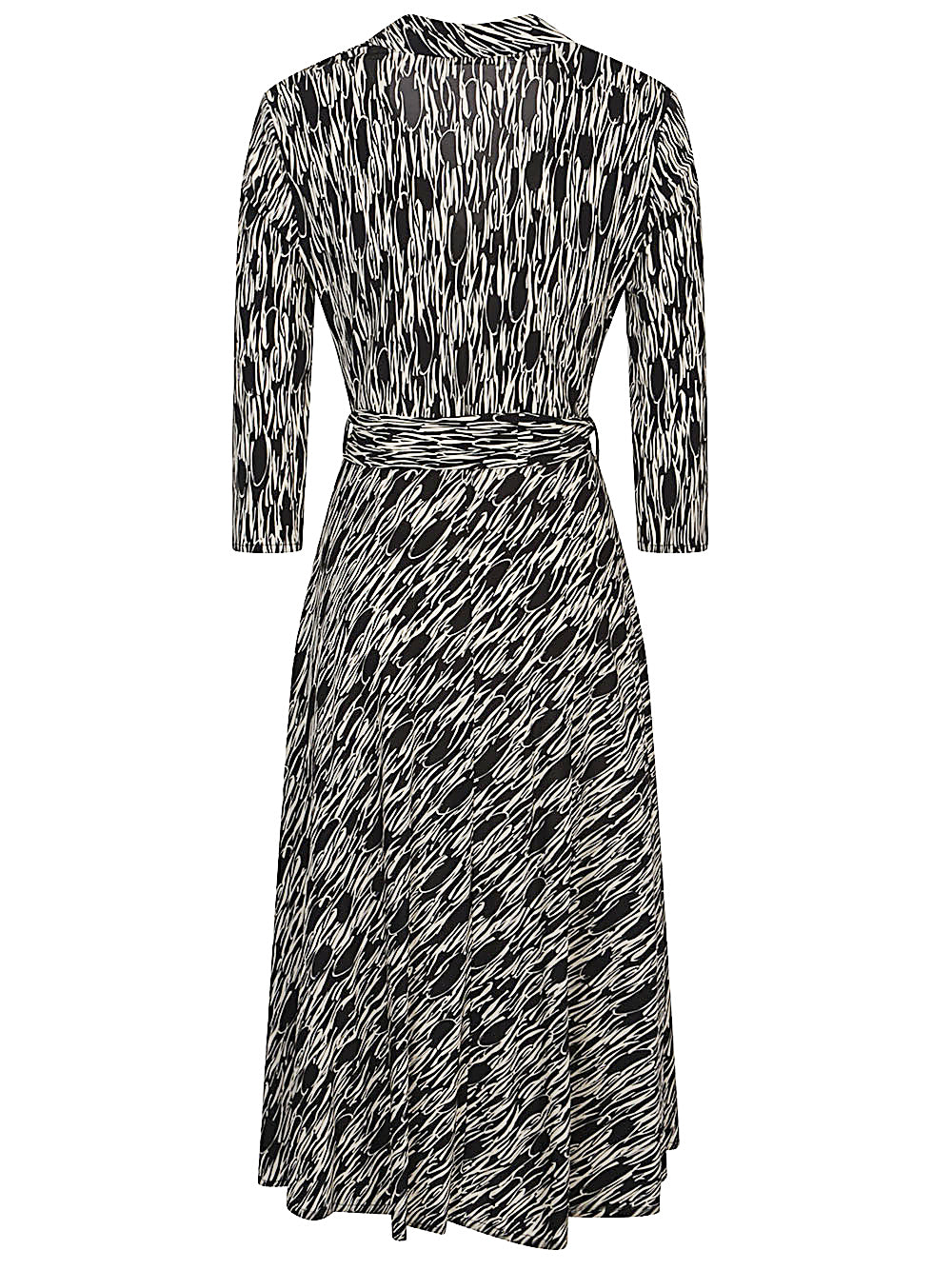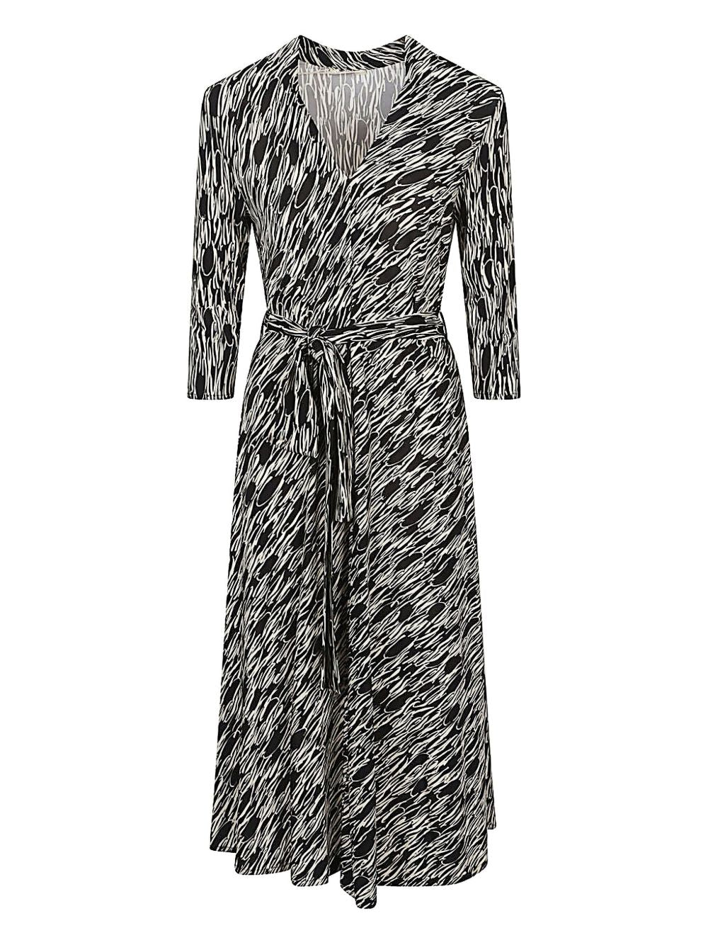 Long dress with all-over multicolor print, made of viscose, V-neck, 3/4 sleeves, multicolor viscose belt, straight hem. Printed midi dress Size and Fit - This piece fits true to size. We recommend you get your regular size. Model is 1,75m / 5ft 8in wearing size 36 (FR)