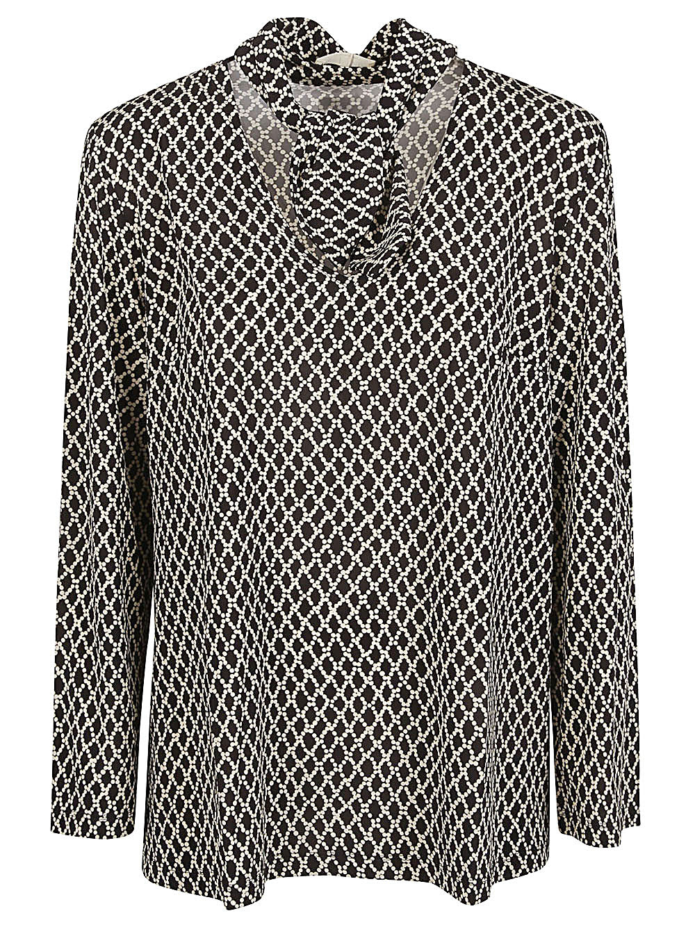 Black shirt, V -neck, neck laces. Printed blouse Size and Fit - This piece fits true to size. We recommend you get your regular size. Model is 1,75m / 5ft 8in wearing size 36 (ES)