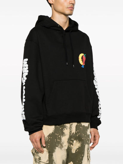 Perennial Shana logo-print hoodie from Sky High Farm featuring triple black, organic cotton blend, logo print at the chest, logo print to the rear, logo print at the sleeve, drawstring hood, drop shoulder, long sleeves, front pouch pocket and ribbed cuffs and hem. This item is made from at least 50% organic materials.. Learn more about what makes a product Conscious on our Conscious Criteria page. Logo cotton hoodie Size and Fit - This piece fits true to size. We recommend you get your regular size. Model is 1,84m / 6ft 1in wearing size M