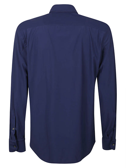 Blue shirt, buttons closure, high collar. Long-sleeves shirt Size and Fit - This piece fits true to size. We recommend you get your regular size. Model is 1,84m / 6ft 1in wearing size 39 (COLLAR CM)