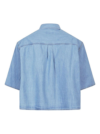 Women's blue denim blouse, oversized straight cut, chest pocket, smooth buttoning, shortened sleeves. Denim cotton shirt Size and Fit - This piece fits true to size. We recommend you get your regular size. Model is 1,75m / 5ft 8in wearing size S