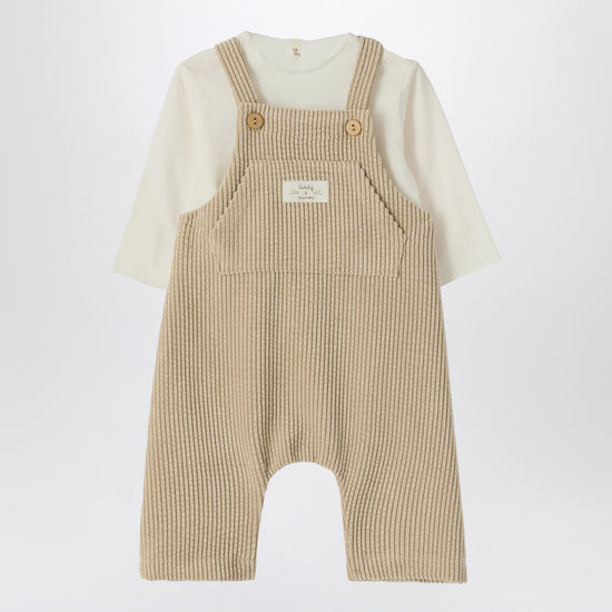 Teddy & Minou two-piece newborn set, consisting of a long-sleeve T-shirt in organic cotton jersey with snap buttons on the shoulder and beige corduroy overalls with wooden buttons, elasticated back waist, and front kangaroo pocket with logo patch.