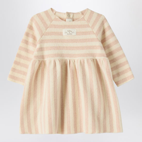 Teddy & Minou baby crew-neck dress in pink striped cotton blend knit, featuring long sleeves, back snap button closure, and front logo patch.