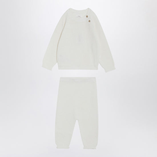 Off-white Teddy & Minou two-piece set in cotton blend yarn, consisting of a crew-neck long-sleeve sweater with wooden buttons on the shoulders and shorts with elasticated waist and ribbed edges.