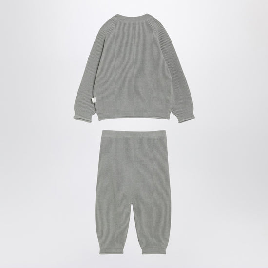 Sage green Teddy & Minou two-piece set in cotton blend yarn, consisting of a crew-neck long-sleeve sweater with wooden buttons on the shoulders and shorts with elasticated waist and ribbed edges.