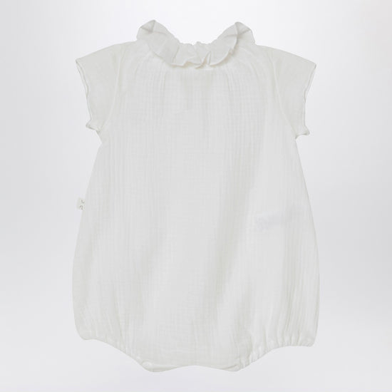Teddy & Minou white cotton romper, featuring a round neck with ruffles, short sleeves, snap buttons at the crotch, and a logo tag on the side.