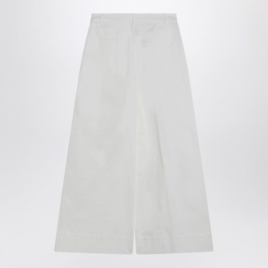 Palazzo pants by The Garment in white cotton, characterized by a front closure with zip and hook, two side welt pockets, belt loops at the waist, and two back welt pockets. Size and Fit - Model wears size 8 UK Model measurements: Height: 180 cm Chest: 85 cm Waist: 66 cm Hips: 89 cm