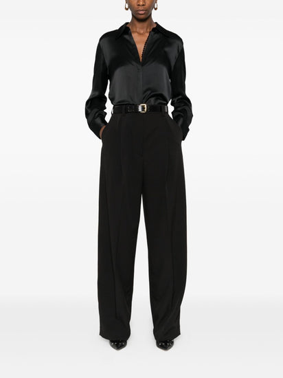 black pleat detail side pockets straight leg mid-rise waist concealed zip fly