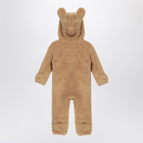 The North Face beige shearling one-piece suit featuring fixed three-panel hood with bear ears, visible asymmetric front zip with internal wind flap and chin guard, regular sleeves, fold-over mittens at cuffs and booties at ankles with elasticated hem, logo label and embroidered logo on chest.