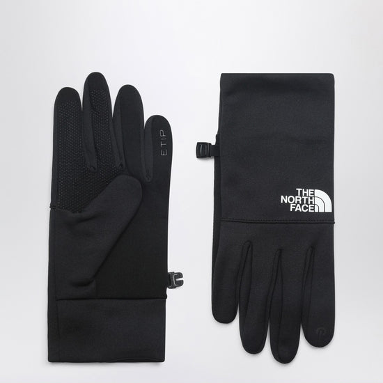 Black recycled stretch fleece gloves from The North Face, featuring a non-slip silicone palm, touchscreen compatible design and contrasting lettering logo.