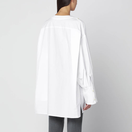 The Latest crewneck shirt in white cotton, featuring long sleeves with buttoned cuffs, oversized fit, shoulder detail with button, side slits, and front button closure. Size and Fit - Model wears size S Model measurements: Height: 178 cm Chest: 83 cm Waist: 63 cm Hips: 91 cm