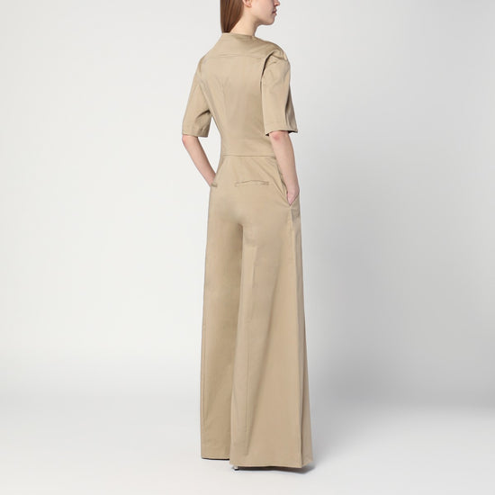 Sand coloured cotton crew neck sweater by The Latest, characterized by wide palazzo pants, belt loops at the waist, hidden front closure, short sleeves, two side welt pockets, and two back welt pockets. Size and Fit - Model wears size 40 IT Model measurements: Height: 179 cm Chest: 83 cm Waist: 61 cm Hips: 88 cm