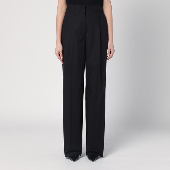 Wide Pantalone by The Latest in black cotton, featuring a front zip closure with hook, high waist with belt loops, two side welt pockets, two back flap pockets, and a crease at the front. Size and Fit - Model wears size 40 IT Model measurements: Height: 179 cm Chest: 82 cm Waist: 65 cm Hips: 90 cm