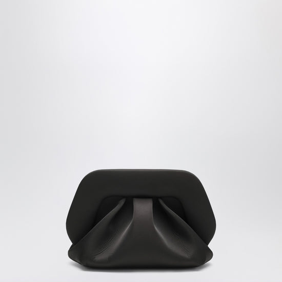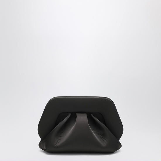 Black satin clutch from THEMOIRÈ featuring a double magnetic closure, a metal top handle, decorative ruffles, a removable shoulder strap, fabric lining and gold metal hardware. Size and Fit - Width 22 cm x Height 15 cm x Depth 10 cm Shoulder strap lenght: 105 cm