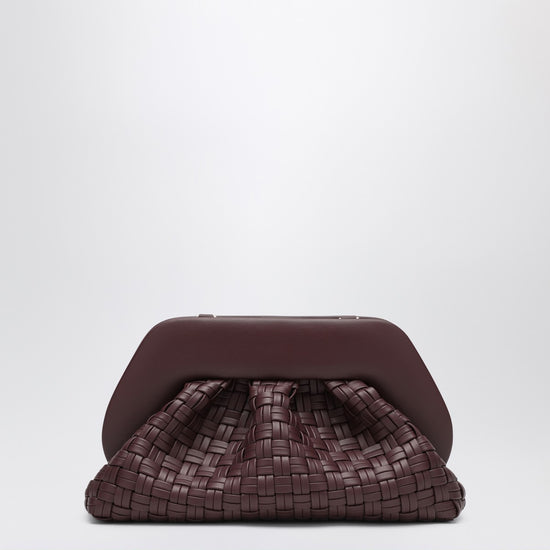 Clutch by THEMOIRÈ in plum-colored vegan leather, characterized by woven workmanship, double magnetic closure, removable shoulder strap, fabric lining, one internal flat pocket, and gold-colored metal hardware. Size and Fit - Width 30 cm x Height 16 cm x Depth 11 cm Shoulder strap lenght: 105 cm