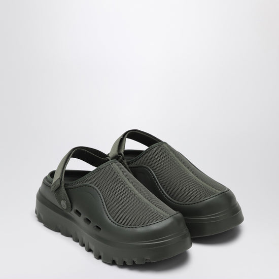 Ugg clogs in forest green mesh and recycled polyester, featuring a removable strap on the heel, PU insole, EVA midsole, round toe, and screen-printed logo on the rubber sole.