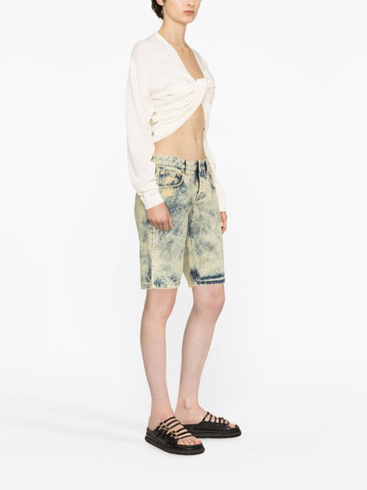 logo-patch denim shorts from Vaquera featuring blue, cotton, washed denim, logo patch to the rear, belt loops, front button and zip fastening, classic five pockets and knee-length. Denim split shorts Size and Fit - This piece fits true to size. We recommend you get your regular size. Model is 1,75m / 5ft 8in wearing size 27 (WAIST CM)