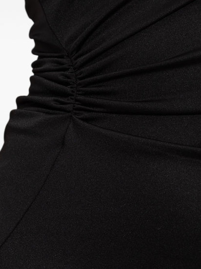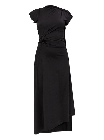 black cap sleeves draped detailing asymmetrical hem fitted waist Midi dress Size and Fit - This piece fits true to size. We recommend you get your regular size. Model is 1,75m / 5ft 8in wearing size 8 (UK)