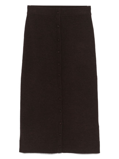 chocolate brown front button placket ribbed waistband ribbed hem fabric-covered buttons Wool midi skirt