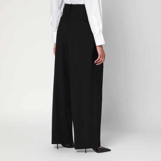 Wide-leg trousers by Victoria Beckham in black virgin wool blend, featuring a high waist with belt loops, side zip closure, two back welt pockets, two side welt pockets, and front pleats. Size and Fit - Model wears size 10 UK Model measurements: Height: 178 cm Chest: 83 cm Waist: 63 cm Hips: 91 cm