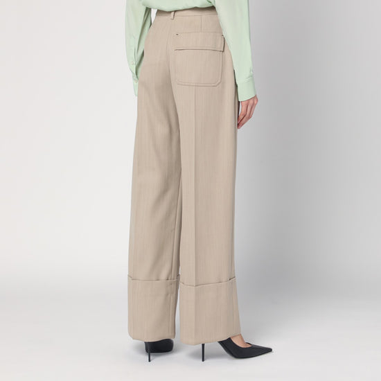 Wide trousers by Victoria Beckham in virgin wool almond colour, characterized by a high waist, front pleats, two side welt pockets, one applied pocket on the back with flap, front closure with zip and hook, and a wide hem at the bottom of the leg. Size and Fit - Model wears size 8 UK Model measurements: Height: 178 cm Chest: 77 cm Waist: 60 cm Hips: 87 cm