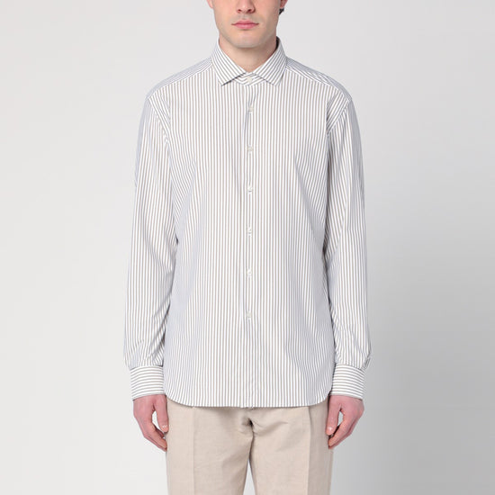 Long-sleeved shirt by Xacus in beige and white striped stretch fabric, featuring French collar, front placket, long sleeves, button cuffs and curved hem. Size and Fit - Model wears size 42 Model measurements: Height: 185 cm Chest: 105 cm Waist: 85 cm Hips: 100 cm